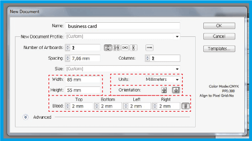 .Dans , définissez la largeur de votre document et, dans le , la hauteur.